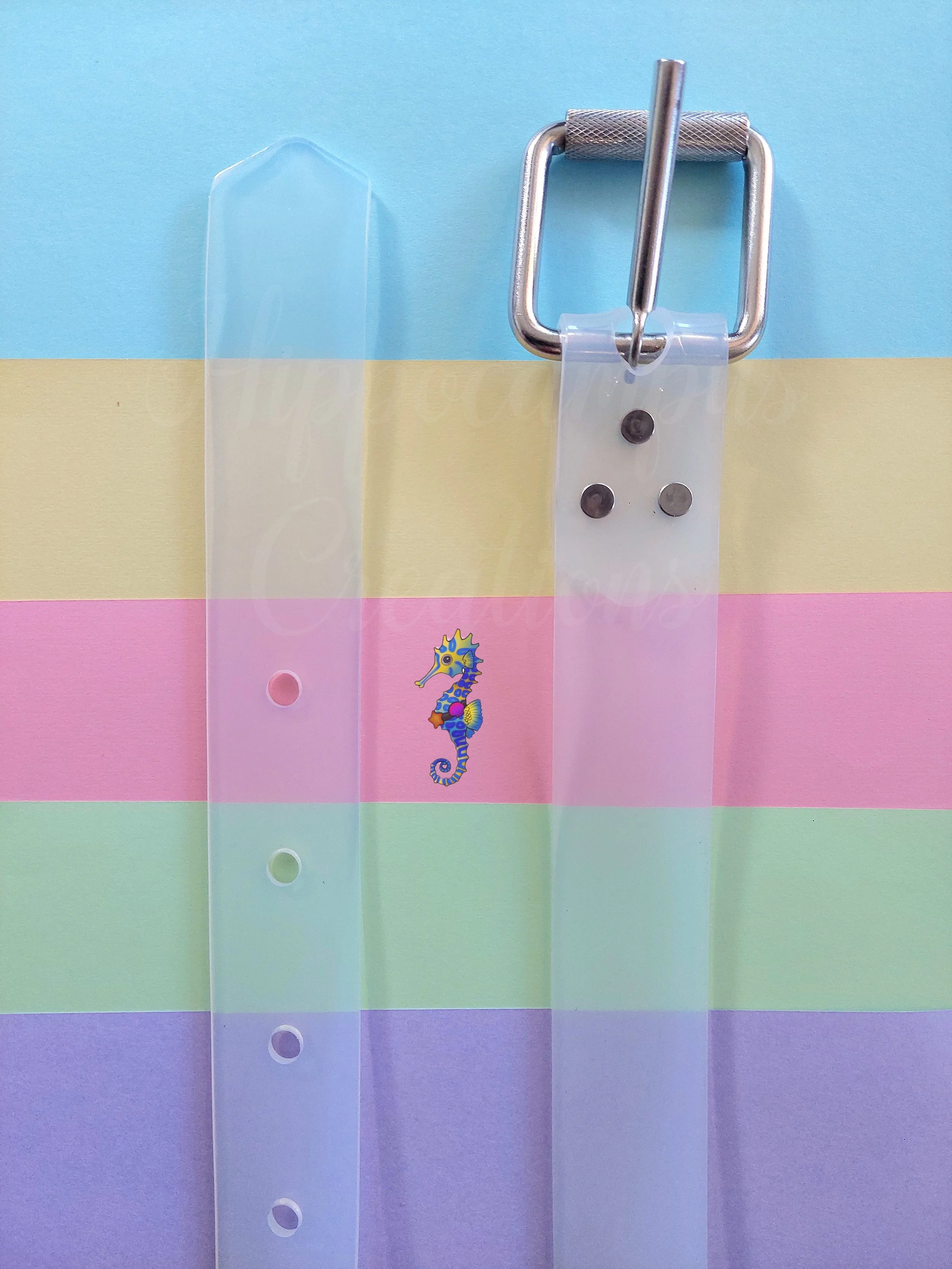 Disclaimer: Any silicone/rubber/resin products that have clear or transparent characteristics are prone to sun damage and yellowing eventually. We cannot control this, nor is there a product immune to the UV or evironments you take your belt into. When not in use, rinse, dry well and store away from direct sunlight.